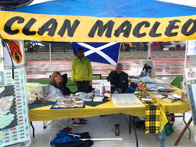 Alison, Allan and Edie at the Clan MacLeod tent at the 2016 Highland Games.  After set up, the rains started and then came in torrents throughout the day.  Everything got wet, including us.  Such a great event but the inclement weather kept people away and participants didn't hang around.  Great days on either side of the event day.  Photo taken by Mark.
